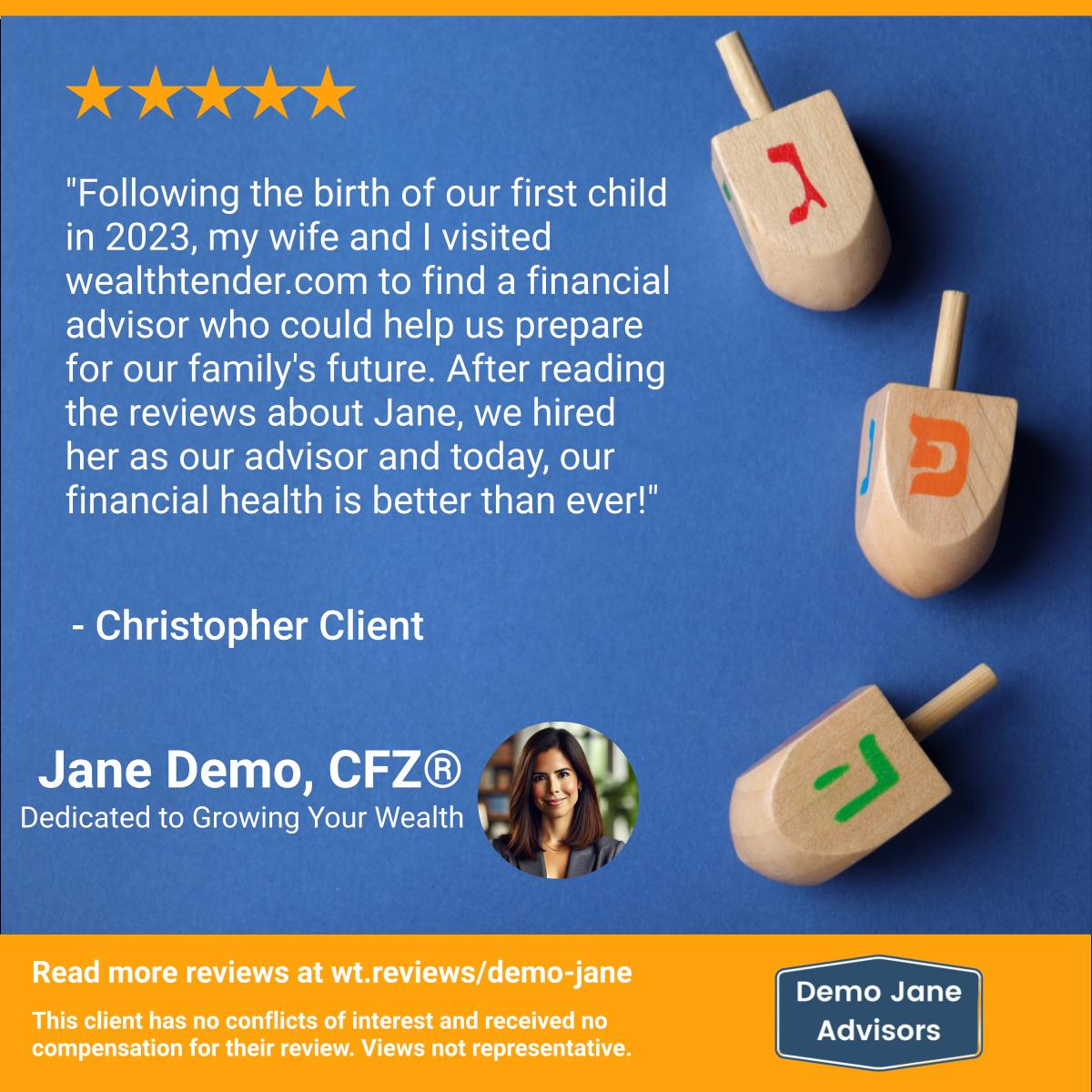 A bright Hanukkah theme with a blue background and wooden dreidels, giving it a cheerful and traditional holiday atmosphere.
